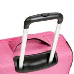 - Telescoping push-button handle locks into place; luggage handle pass-through panels; smooth-rolling wheels for easy mobility