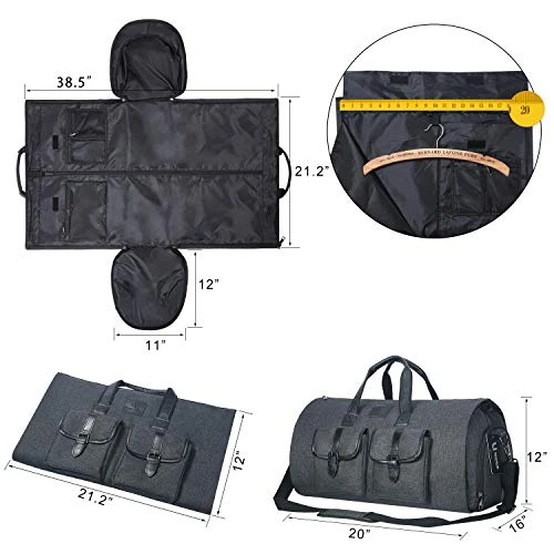 - LARGE CAPACITY DUFFEL BAG – After assembled, this garment duffel bag work perfect as a 45L duffel bag. Thanks to multiple interior zipper pockets, it maximizes storage capacity, holding everything from suits, dresses to shoes and ties For even more space, we added an exterior pocket that provides easy access to electronics and travel or business documents, so you can just focus on having a fantastic trip!