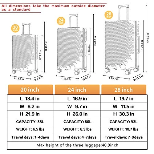 - Three different size: Size: 20inch (21.9 x 8.2 x 13.4), 24inch (16.9 x 9.7 x 26) 28inch (19.7 x 11.5x 30.3) 20inch could be carry on and perfect for business/personal travel.