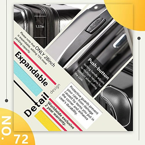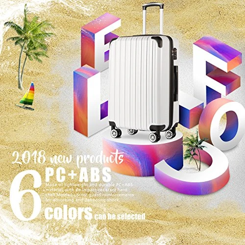 Details: Designed for the modern traveller Made of lightweight and durable PC+ABS material, this luggage is crafted to resist impact. Soft touch top and side carry handles provide maximum comfort while travelling, and an integrated TSA-accepted combination lock will keep your belongings safe. Additional features include an expandable main compartment(28in only) for maximum packing capacity and silent, double spinner wheels. The protective film is not problem Peel off the protective film can be a headache, However, this is not the case this time, the most difficult part had already been peeled off by the factory, like the wheel and handle area, all you need to do is peel off the main body’s protective film. As easy as pie. Features of the luggage 28inch is expandable for up to 15% additional packing capacity; 20inch is perfect carry-on, 24inch is ideal for personal or business trip. Handle: 3-step 100%pure aluminum telescoping handle for comfortable maneuvering. Wheels: four spinner wheels allow the suitcase to move seamlessly through 360 degrees of motion. Interior: The interior is fully lined with multi-use organizational pockets make it easy for packing clothes. TSA Lock: TSA lock for peace of mind. Measures: 20inch (15.4 x 8.7x 22.4), 24innch (17.3 x 9.8 x 26.4) 28inch (20.5 x 11x 30.3)(13in when it is expandable) Capacity: 20in38L , 24in60L, 28in 93L(110L when it is expandable) Weight: 20in 6.7lbs 24in8.1lbs 28in10.8lbs Travel days: 20in1~4days 24in4~7days 28in 7~9days
