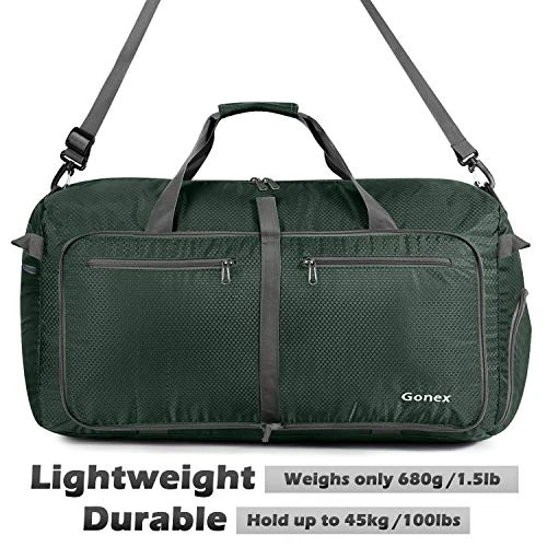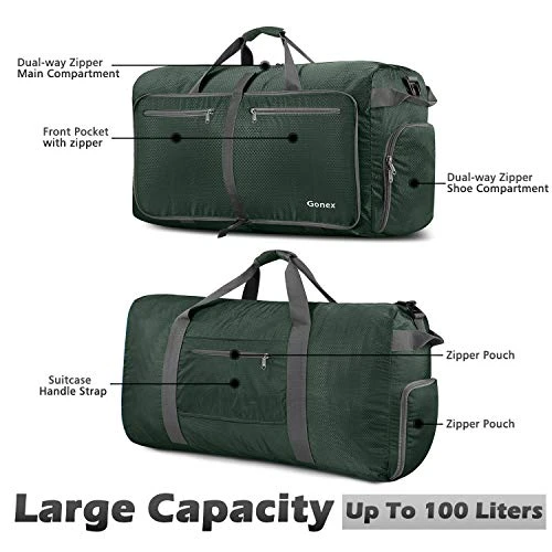 Details: Gonex 100L Travel Duffel Bag, Foldable Duffle for Sport, Gym, Storage, Luggage, Shopping What’s it? As you may have bought our Gonex 60L/80L Duffel Bag before, this Bag is larger-100 liters capacity, which can be used as a large sports and gym duffle bag as well as travel duffle when you are on and about. What’s more, it can be even used as a dirty laundry compartment at home. Its high quality and durable material provides the same function as a large suitcase. It’s fashionable and outstanding design which will make your journey more colorful and graceful. Specifications: Product Dimensions: 31.89 x 16.93 x 11.81 inches Shipping Weight: 1.74 pounds Capacity: 100 liters Color: Black / Dark green / Red / Purple / Deep blue Package Dimensions: 12.8 x 12.8 x 1.6 inches Package included: 1 x Gonex Travel Duffel Bag