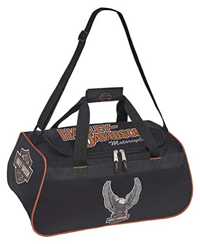 Details: Harley-Davidson Eagle Logo Sports Duffel w/ Strap, 99417-EAGLE. Made of lightweight, super strong water-resistant polyester. Self-healing nylon coil zippers. Industrial strength webbing should strap and handles. Rubber feet on the bottom. Interior pocket. Size: 20″ x 9″ x 10″.